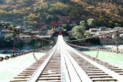 瀘定橋橋長(zhǎng)103米,寬3米,13根鐵鏈固定在兩岸橋臺(tái)落井里,9根作底鏈,4根分兩側(cè)作扶手,共有12164個(gè)鐵環(huán)相扣,全橋鐵件重40余噸。兩岸橋頭堡為木結(jié)構(gòu)古建筑,風(fēng)貌獨(dú)特,為我國(guó)國(guó)內(nèi)獨(dú)有。自清以來(lái),此橋?yàn)樗拇ㄈ氩氐闹匾ǖ篮蛙娛乱颉?935年5月29日,中國(guó)工農(nóng)紅軍長(zhǎng)征途經(jīng)這里飛奪瀘定橋而使該橋聞名中外。